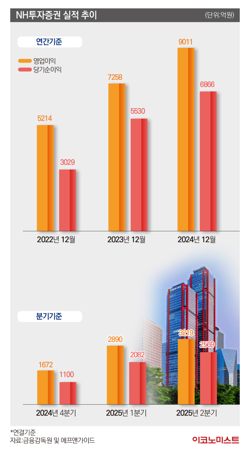 IB 출신인 그의 경력은 흔히 ‘숫자 중심’ ‘거래 중심’으로 요약할 수 있다. 실제 윤 대표 체제에서 NH투자증권의 실적은 빠르게 회복세를 보이고 있다. 2024년 상반기 기준 영업이익은 전년 대비 24% 증가하며, 순이익 규모도 업계 상위권에 진입했다. ROE(자기자본이익률)는 12% 달성을 목표로 하고 있으며, 자산관리(WM) 부문 수익 비중이 꾸준히 확대되고 있다. 올해 3분기 연결 기준 영업이익 역시 전년 동기(1881억원) 대비 108.1% 증가한 3913억원을 기록했다. 같은 기간 당기순이익은 2931억원으로 전년(1539억원)보다 90.4% 늘었다.