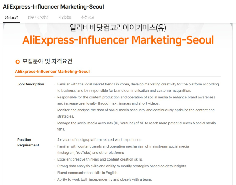 업계에 따르면 알리는 현재 인플루언서 마케팅 담당자를 채용 중이다. 알리는 지난 6월 K-패션 인플루언서와 함께하는 베타 버전의 신개념 커머스(상거래) 프로젝트 ‘셀럽숍’(Celeb Shop)을 론칭하고 참여할 국내 인플루언서를 모집했다.
