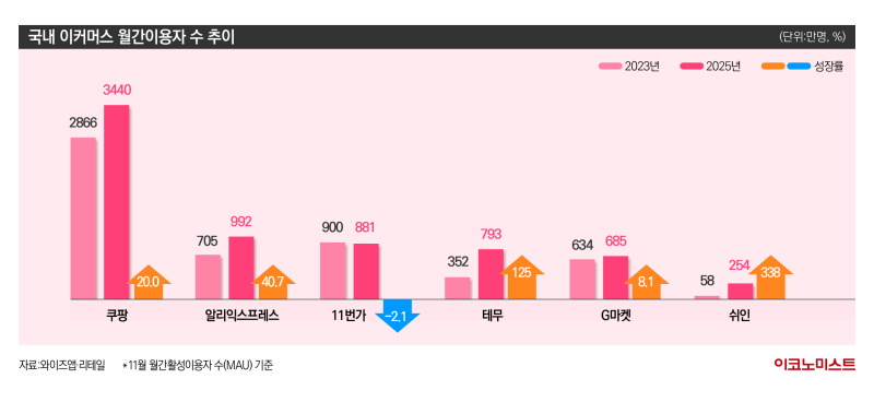 압도적 1위를 유지 중인 쿠팡도 성장세가 정체됐다는 평가다. 쿠팡의 MAU는 지난 2023년 11월 2866만명에서 올해 11월 3439만명으로 증가했지만, 성장률은 약 20%에 그쳤다. ▲알리(40.7%) ▲테무(125%) ▲쉬인(338%) 등 C-커머스의 성장률에 한참 못 미치는 수준이다.