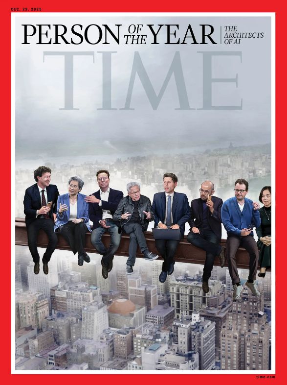 타임은 올해의 인물 특집호의 두 가지 표지를 공개했는데, 하나는 AI 기업 최고경영자(CEO)들의 이미지를 활용한 일러스트다. 타임지가 선정한 '역사상 가장 영향력 있는 사진 100선' 중 하나인 1932년작 '마천루 위의 점심'을 오마주한 이 그림에는 왼쪽부터 마크 저커버그(메타), 리사 수(AMD), 일론 머스크(테슬라), 젠슨 황(엔비디아), 샘 올트먼(오픈AI), 데미스 허사비스(구글 딥마인드), 다리오 아모데이(앤트로픽), 페이페이 리(월드랩스) CEO가 나란히 앉아있다.