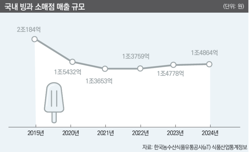 10년 새 시장 약 30% 축소한국농수산식품유통공사(aT) 식품산업통계정보에 따르면 지난 2024년 국내 빙과업계 소매점 매출은 1조4864억원으로 집계됐다. 10년 전보다 약 28.4% 줄어든 수준이다.
